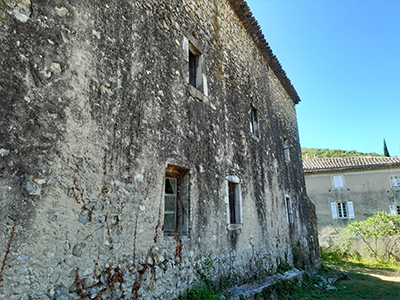 Son las 11:45 y me meto a explorar cruzando el río La Nègue; me encuentro un caserón precioso, en un sitio que se llama Dausseron, pero no puedo pasar, porque por un lado hay una cadena (con su disco rojo disco ojo)y por otro demasiada maleza.