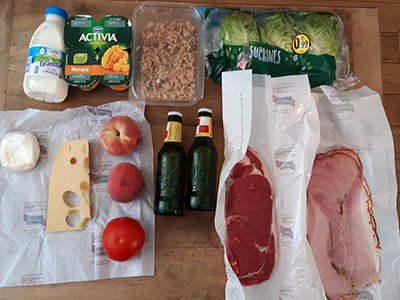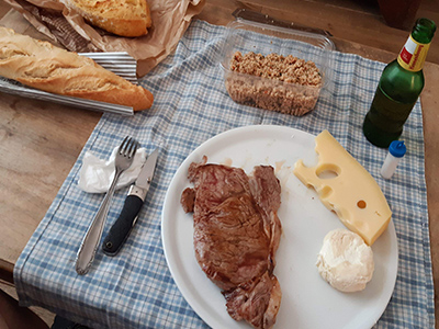 Me gasto 25 euros en cosas para comer bien y compensar la falta de hoy; una vez acomodado, me hago un buen menú, con un filetazo que realmente está riquísimo, y el tabulé también, fresquito y sabroso. Son las 17:30 y me harto de comer!